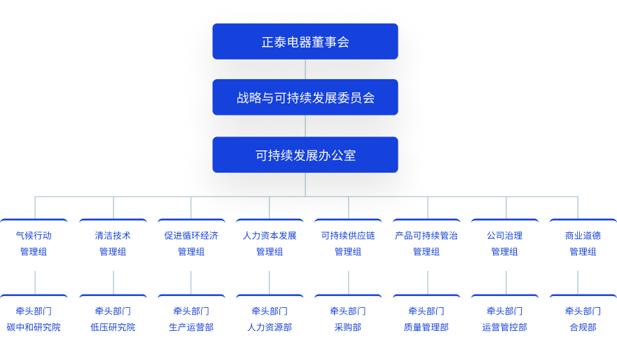 为更好贯彻落实可持续发展工作,正泰电器现已正式成立由董事会、战略与可持续发展委员会和可持续发展办公室组成的三级ESG治理架构。