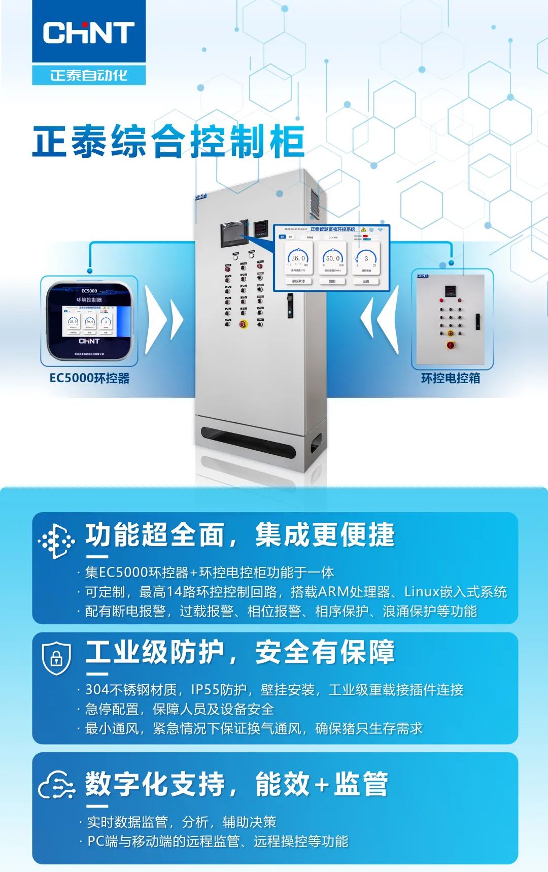 正泰自动化科技智能环控方案以环境控制器和环控电控柜为核心,搭载数字化平台,实现对猪舍环境的最佳控制和实时监管,提高猪只的生产性能。