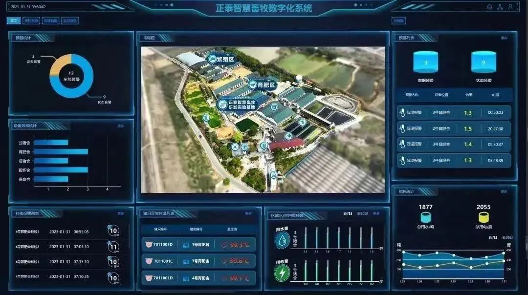 “正泰智慧养猪数字化平台”,可实现一界面实时监管猪场设备数据,对安防事件、设备故障进行及时预警,对环控、电控、料线、防疫等设备统一监管,对洗消烘干、水电使用能耗进行统计和分析。